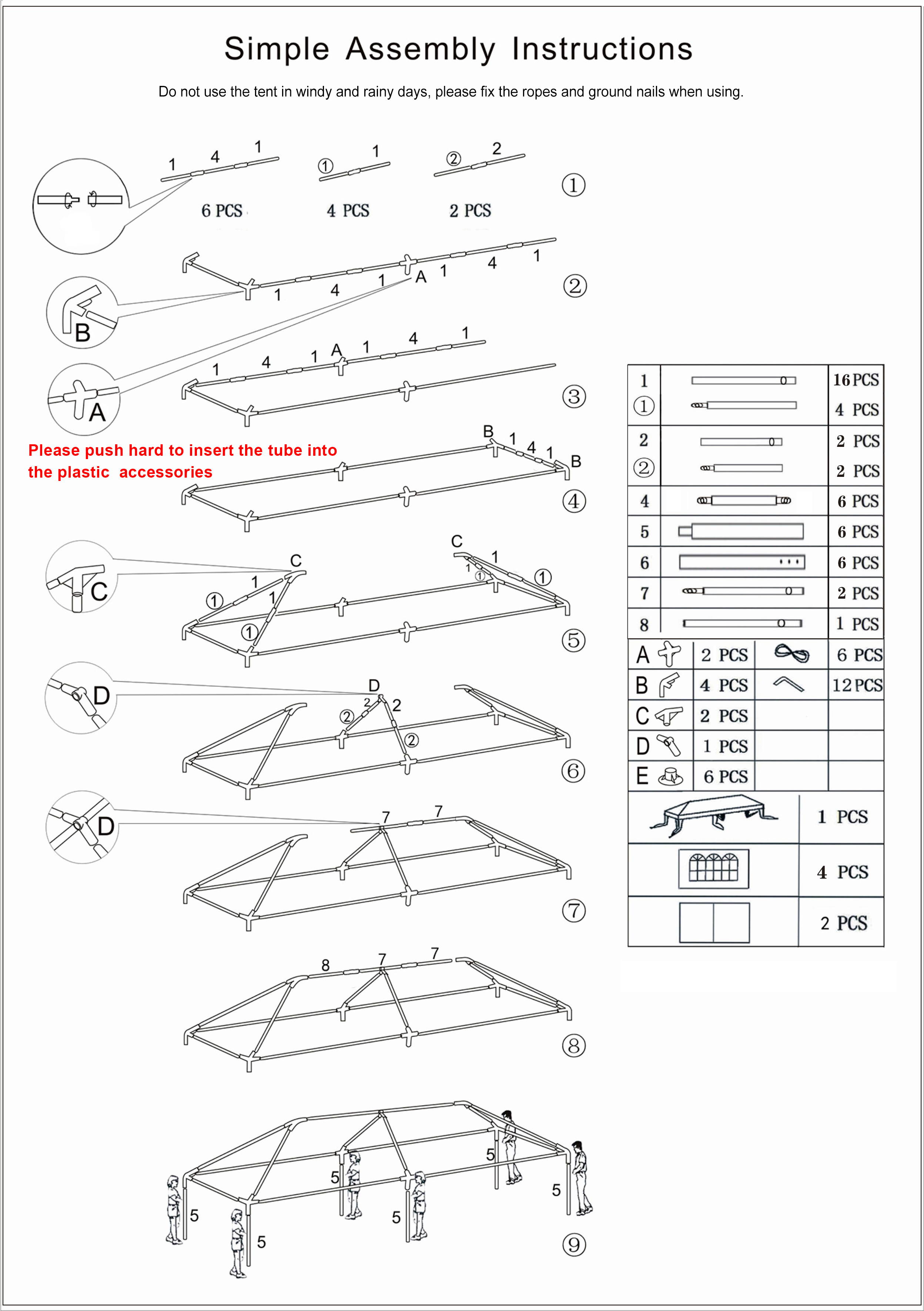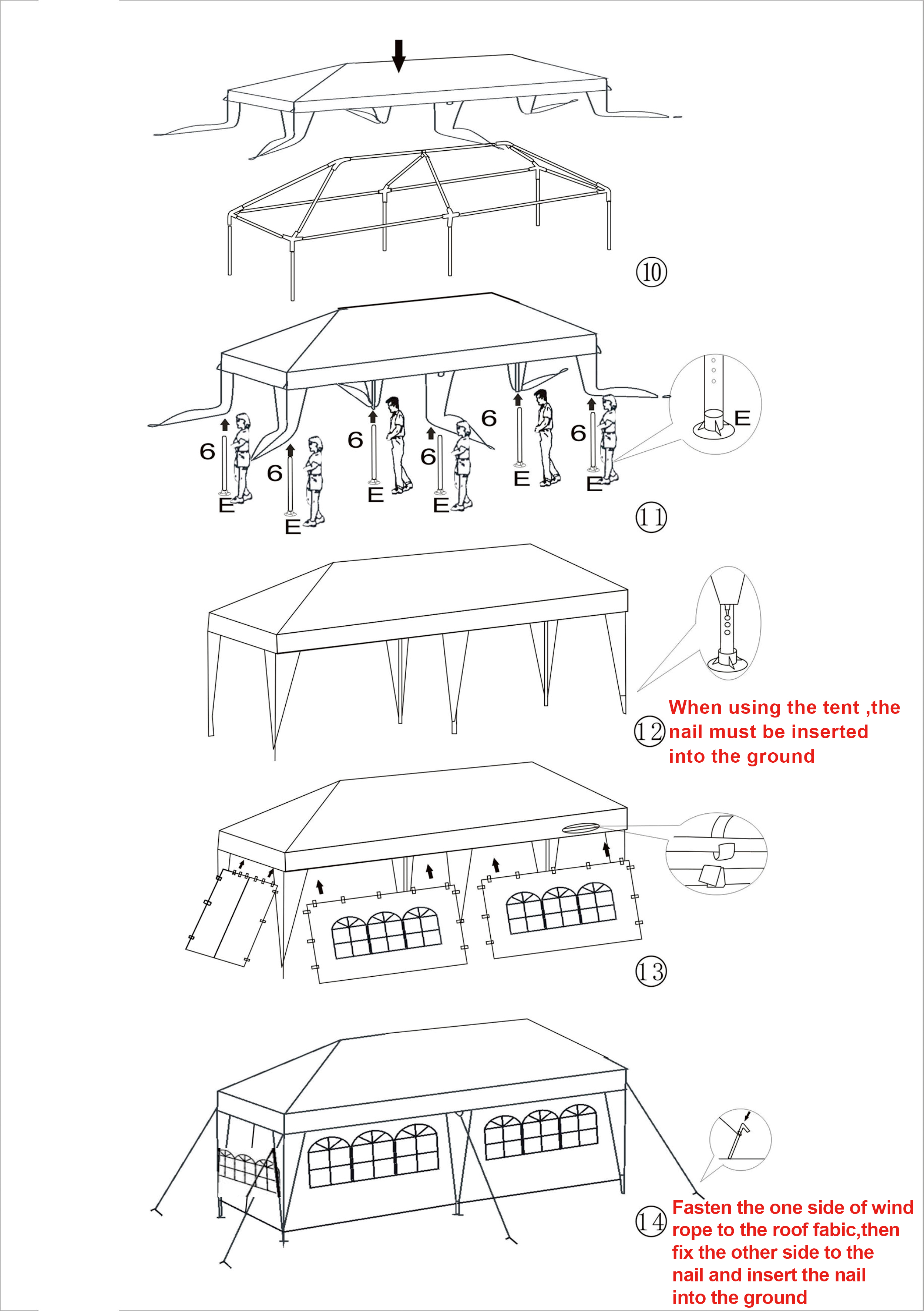 5. ATTENTION: Do not use the tent in windy or rainy days. Please use ropes and ground stakes to secure the tent.
